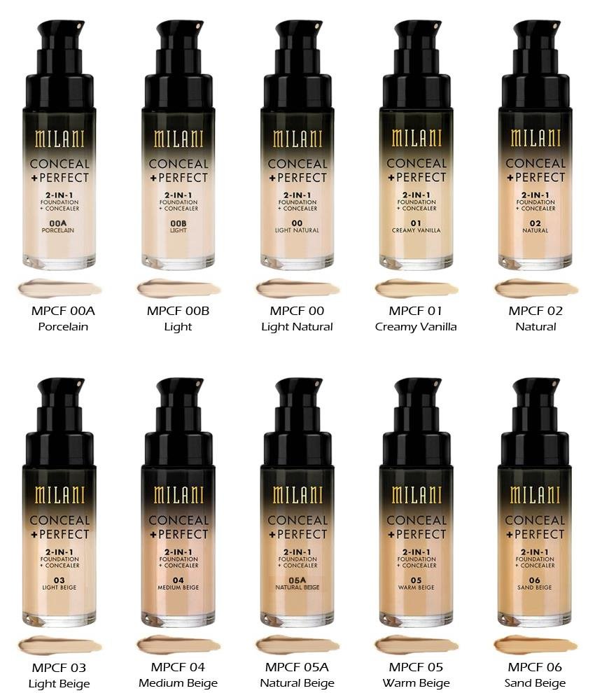 | Base Conceal+Perfect de Milani Tonos | 00AA-Ivory, 01-Creamy Vanilla, 02-natural, 02A-Creamy Natural, 03-Light Beige, 04-Medium Beige, 05-Warm Beige, 06-Sand Beige, 06A-Deep Beige, 07-Sand |