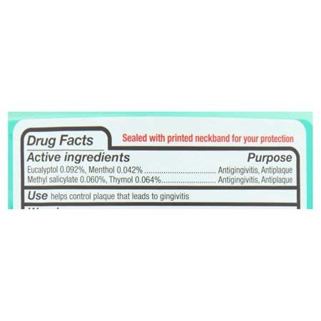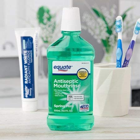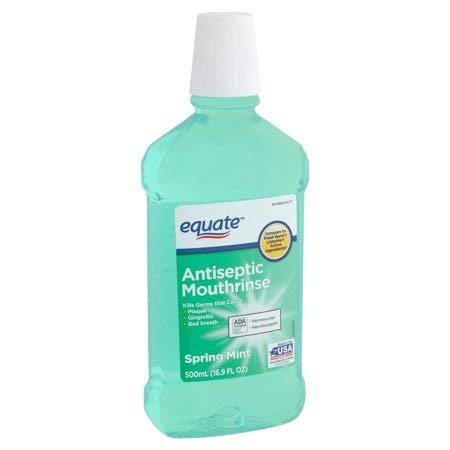 Ingredientes inactivos: agua, alcohol 21.6%, solución sorbitol, sabor, poloxamer 407, ácido benzoico, sacarina de sodio, citrato de sodio, D&C amarillo No. 10, FD&C verde no. 3 Características del producto Equate Spring Mint Antiséptico enjuague bucal, 16.9 fl oz antiséptico mata los gérmenes que causan placa, gingivitis y mal aliento aceptado por ADA sabor a menta primavera sellado con banda para el cuello impreso para su protección.